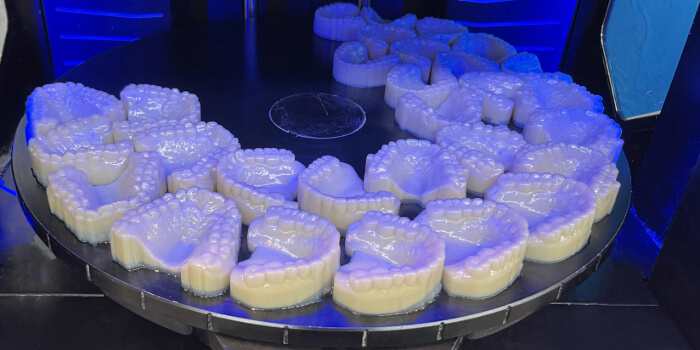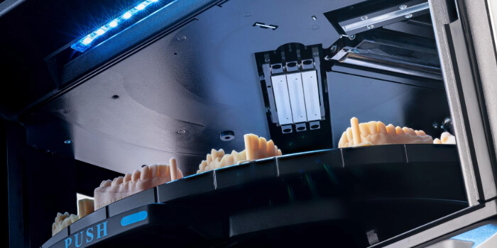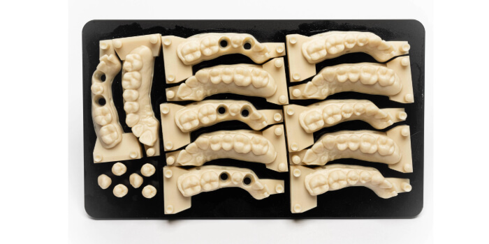 Modelli dentali, guide chirurgiche e maschere gengivali possono essere stampati contemporaneamente sullo stesso vassoio.