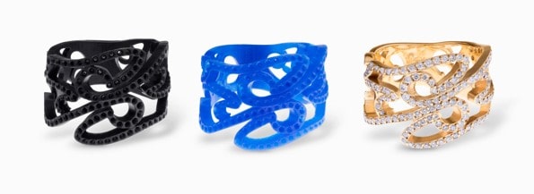 Prototipo di anello in resina per stereolitrografia, matrice per microfusione in resina calcinabile e oggetto finale.