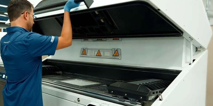La tecnologia SAF, esclusiva di Stratasys, utilizza testine di stampa di livello industriale per applicare con precisione un fluido di fusione su un letto di polvere. Una lampada a infrarossi fonde poi le particelle in modo selettivo, ottenendo così il particolare voluto.