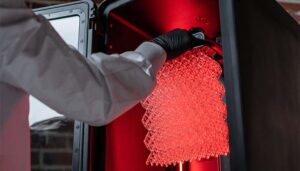 Un pezzo monolitico in resina viene estratto dalla camera di stampa di Stratasys Origin
