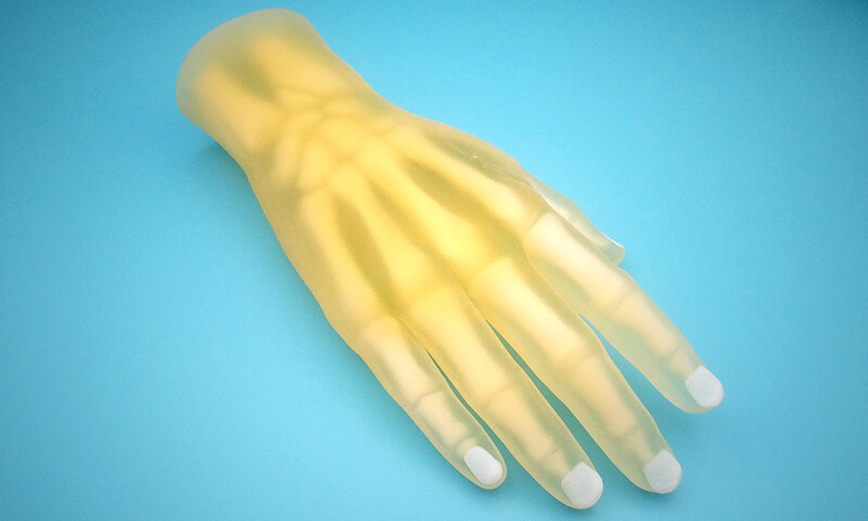 Modello di mano stampato in 3D con materiali Stratasys PolyJet Agilus30, BoneMatrix, GelSupport, SUP706, TissueMatrix, VeroPureWhite RGD837