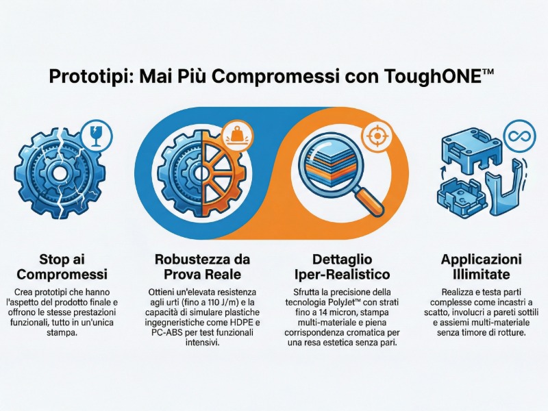 Con ToughONE, il nuovo materiale resistente per la stampa 3D, puoi ottenere maggiore resistenza e durata per le tue parti realizzate con la tecnologia PolyJet di Stratasys, nota da tempo per il realismo a colori, le caratteristiche precise e la stampa multi-materiale.